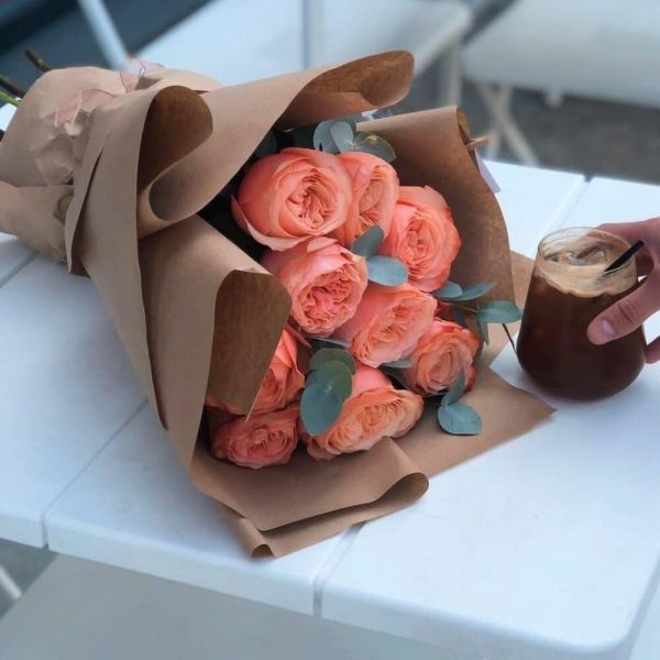 Эвкалипт - 1 шт. Упаковка дизайнерская - 1 шт. Пионовидная роза кахала - 9 шт.